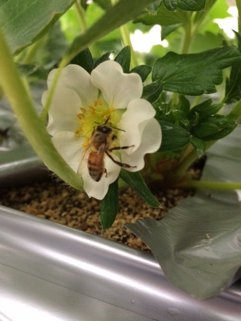 イチゴの花も咲き始めたので、ハウス内にミツバチを入れました!
