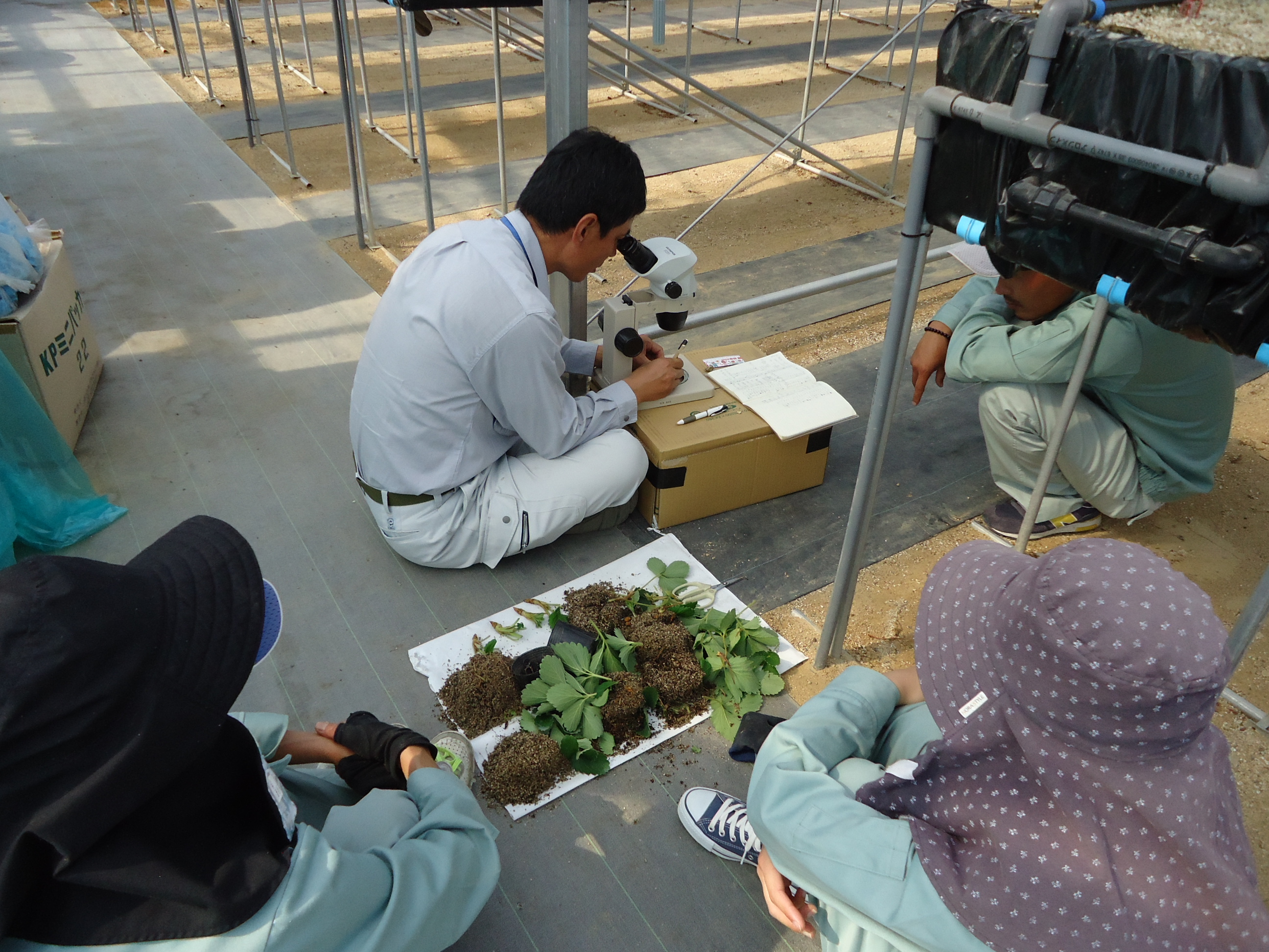 で、各地のイチゴ栽培農家にとても信頼されている先生です。)にお越しいただき、検鏡をして