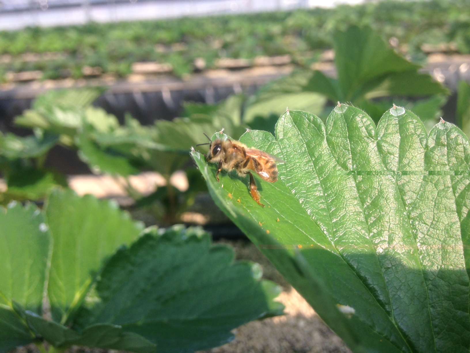 ▼ 2015年10月10日 ▼ミツバチが来ました! イチゴの定植も無事に終わり、根もしっかりしてきました! かおり野は極早生性で、ちらほらと花が咲き始めています♪ 花が咲き始めたということで、受粉のためにミツバチの巣箱を設置しました! まだ来たばかりで慣れていない様子ですが、 早く元気にハウス内を飛び回ってくれたらなと思います^^ ↑撮れました!ばっちりカメラ目線です!! 可愛いですね~!頑張ってね☆