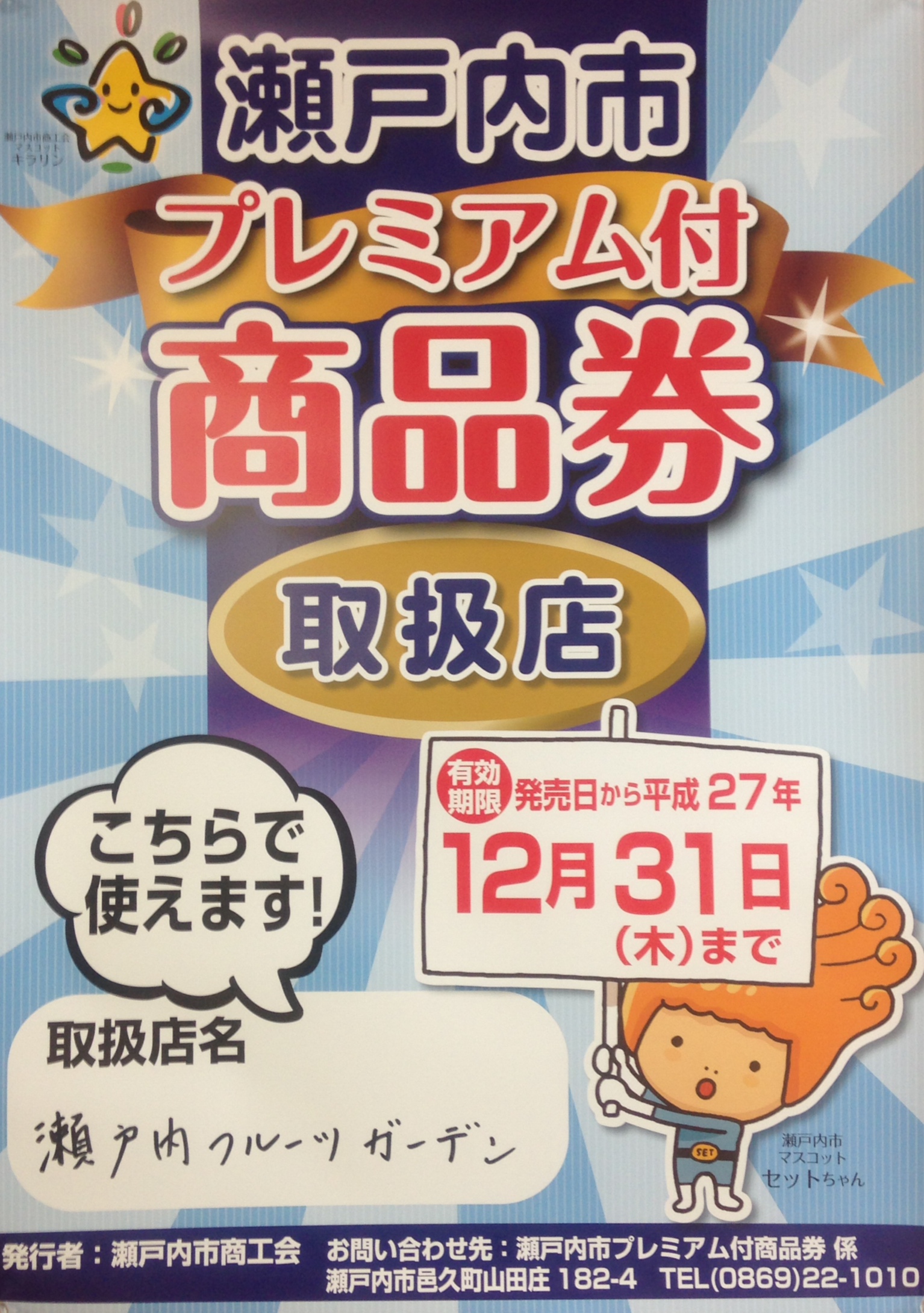 「瀬戸内市プレミアム付商品券」がご利用頂けます。