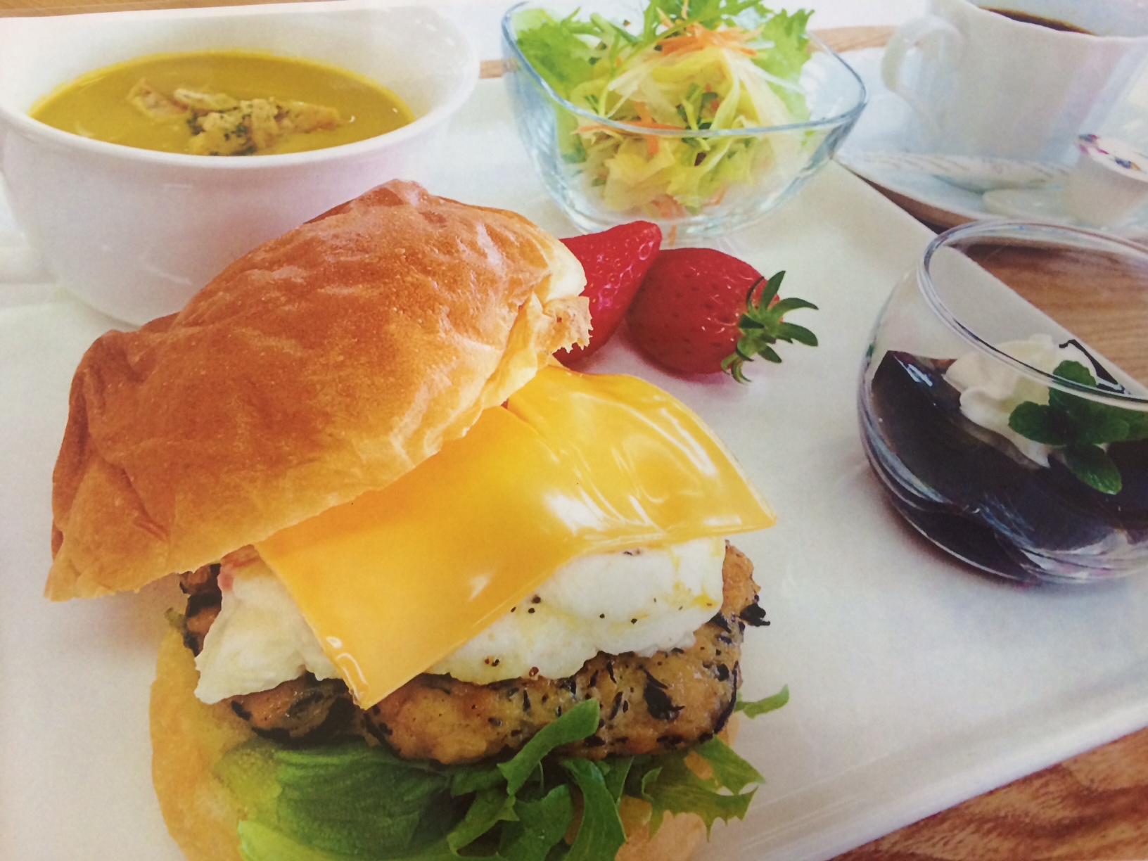 ▼ 2015年3月20日 ▼3月21日(土)から、さんカフェ新メニュー!! 3月21日(土)から、’’特製つくねバーガー’’がさんカフェメニューに新登場します☆ 福まる工房さんのバンズとアルムの里さんの卵を使用した特製バーガーです♪ 具材にはヘルシーな豆腐とひじきが入った、とりつくねとポテトサラダ、チーズ、卵、レタスを使っております。 価格は、特製つくねバーガーにサラダ・スープ・デザート・いちごが付いて700円です!! プラス150円で、お飲み物がコーヒー・紅茶・オレンジジュースの中からお選び頂けます♪ こだわりの逸品となっておりますので、是非一度ご賞味下さい^^*